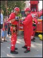 | Gleich nach der Modenschau ging es dann auch im Aussenbereich mit einer feuerwehrtechnischen Vorführung weiter. Die Höhenrettungsgruppe Main-Taunus - bestehend aus den Wehren in Sulzbach, Hattersheim und Bad Soden - zeigte ihr Können an einer ausgefahrenen Drehleiter, die rückwärts (also von unten!) bestiegen wurde, oder seilten sich von der Leiter aus grösserer Höhe ab.
