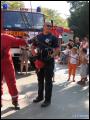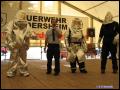 | Am Nachmittag fand eine Feuerwehr-Modenschau im Festzelt statt, bei der die Gäste einige Einsatzgarnituren bestaunen konnten. Neben den gewohnten Uniformen und der Brandschutzkleidung wurden ein Waldarbeiter-Anzug, ein Imkerschutz, ein Überlebensanzug für Gewässer, die Höhenretter-Uniform, sowie schwere Chemieschutzanzüge und Hitzeschutzanzüge vorgeführt. Marcel Walter, der die Modenschau moderierte, ging hier auf spezielle Details eines jeden Anzugs ein. So hat zum Beispiel der Waldarbeiter eine ganz spezielle Schutzkleidung, die innen aus einer Vielzahl langer Fasern besteht. Durchtrennt die Kette der Motorsäge die oberste Stoffschicht der Schutzhose, werden ganze Faserbündel herausgerissen. Die losen Fasern blockieren das Kettenrad völlig und bringen die Sägekette somit zum Stillstand. Dadurch wird das Risiko einer Verletzung erheblich vermindert.