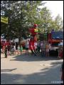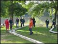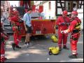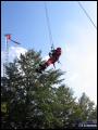 | Gleich nach der Modenschau ging es dann auch im Aussenbereich mit einer feuerwehrtechnischen Vorführung weiter. Die Höhenrettungsgruppe Main-Taunus - bestehend aus den Wehren in Sulzbach, Hattersheim und Bad Soden - zeigte ihr Können an einer ausgefahrenen Drehleiter, die rückwärts (also von unten!) bestiegen wurde, oder seilten sich von der Leiter aus grösserer Höhe ab.