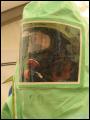 Weiterhin wurden Hitzeschutzanzüge in drei verschiedenen Ausführungen - von leichtem Schutz über mittleren bis hin zu schwerem Hitzeschutz - gezeigt. Während man einen Wohnungsbrand (600 bis 800°C) noch unter normaler Brandschutzkleidung löschen kann, verursachen bestimmte Feuer, wie zum Beispiel ein brennender Benzin-Tanklaster, erheblich höhere Temperaturen. Damit sich Feuerwehrleute dennoch dem Brand soweit nähern können, dass eine Brandbekämpfung möglich ist, gibt es Hitzeschutzanzüge. Diese bestehen aus einem speziellen Material, das die Wärmeentwicklung zumindest teilweise abweisen kann. Einige dieser Garnituren kommen aufgrund ihrer Spezialisierung so selten zum Einsatz, dass es sogar für Feuerwehrleute selbst eine höchst interessante Vorführung war.